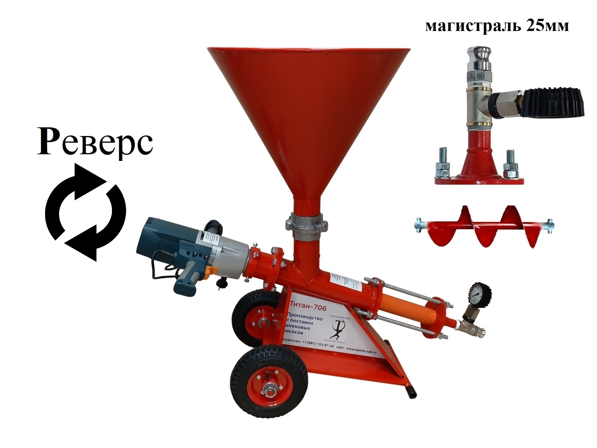 Насос Титан 706 ДМБ Р + реверс, смесительный вал, стальной бункер, фланец шнековой пары, соединения камлок, кран, шланг - увеличенного внутреннего диаметра 25мм (1 дюйм), улучшенная подача при штукатурных работах и торкретировании, при цементации грунтов.
